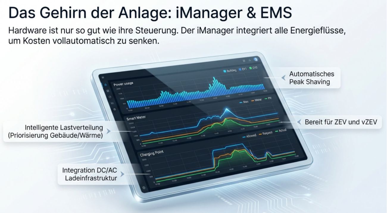 Moderne Energiemanagementsysteme bilden die zentrale Steuerungseinheit eines Gebäudes oder gesamten Areals. Sie koordinieren Energieflüsse zwischen Photovoltaikanlage, öffentlichem Stromnetz, Batteriespeicher sowie Verbrauchern wie AC- und DC-Ladeinfrastruktur – dynamisch und in Echtzeit.